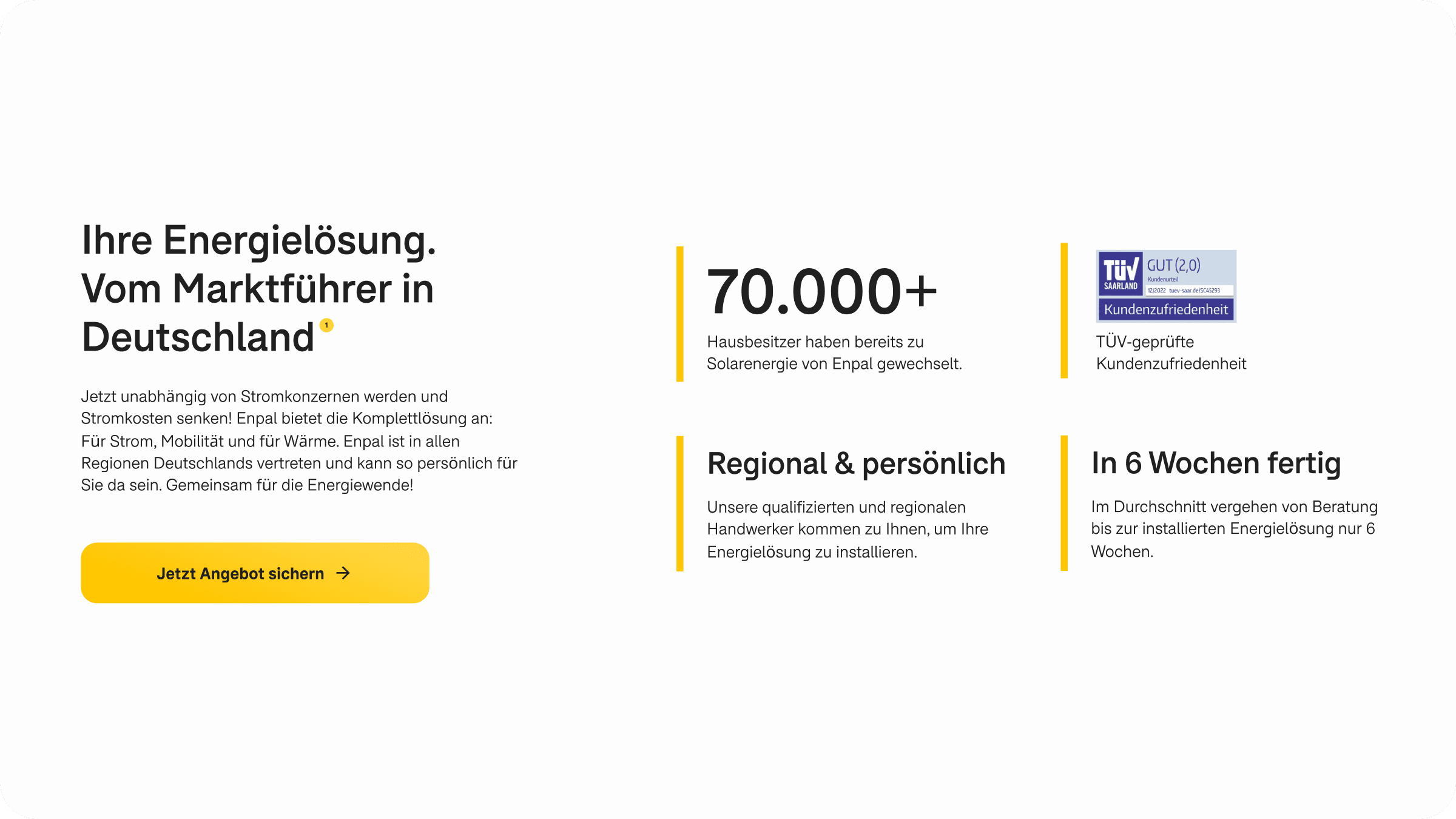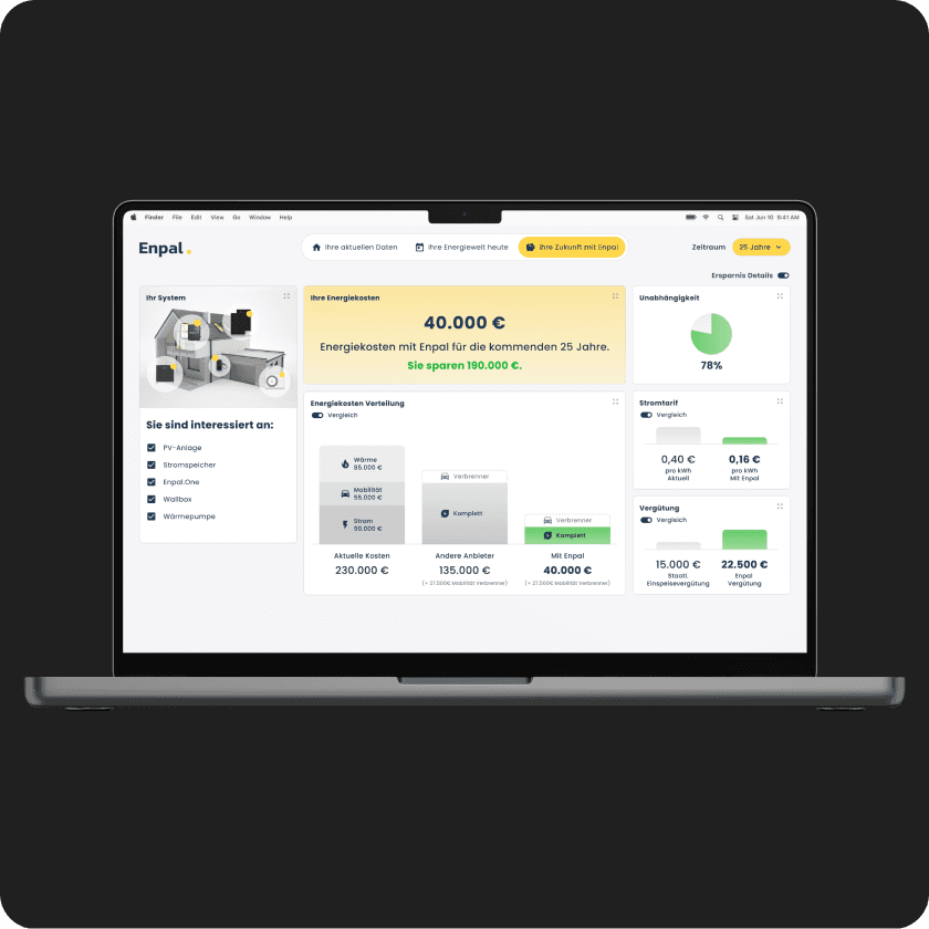 Seit dem ersten Tag steht Silberpuls an der Seite des Enpal-Gründungsteams – und hat mitgeholfen, die Marke, die Produkte und die Tools zu formen, die ihre Vision Wirklichkeit werden ließen. In über acht Jahren Zusammenarbeit ist aus einem einfachen, zeitlosen Schriftzug ein ganzes digitales Ökosystem geworden – mit skalierbaren Nutzererlebnissen und maßgeschneiderten Sales-Tools. Diese langjährige Partnerschaft hat es uns ermöglicht, uns gemeinsam weiterzuentwickeln: Wir haben uns angepasst, dazugelernt und mitgestaltet – in jeder Phase von Enpals Reise.
