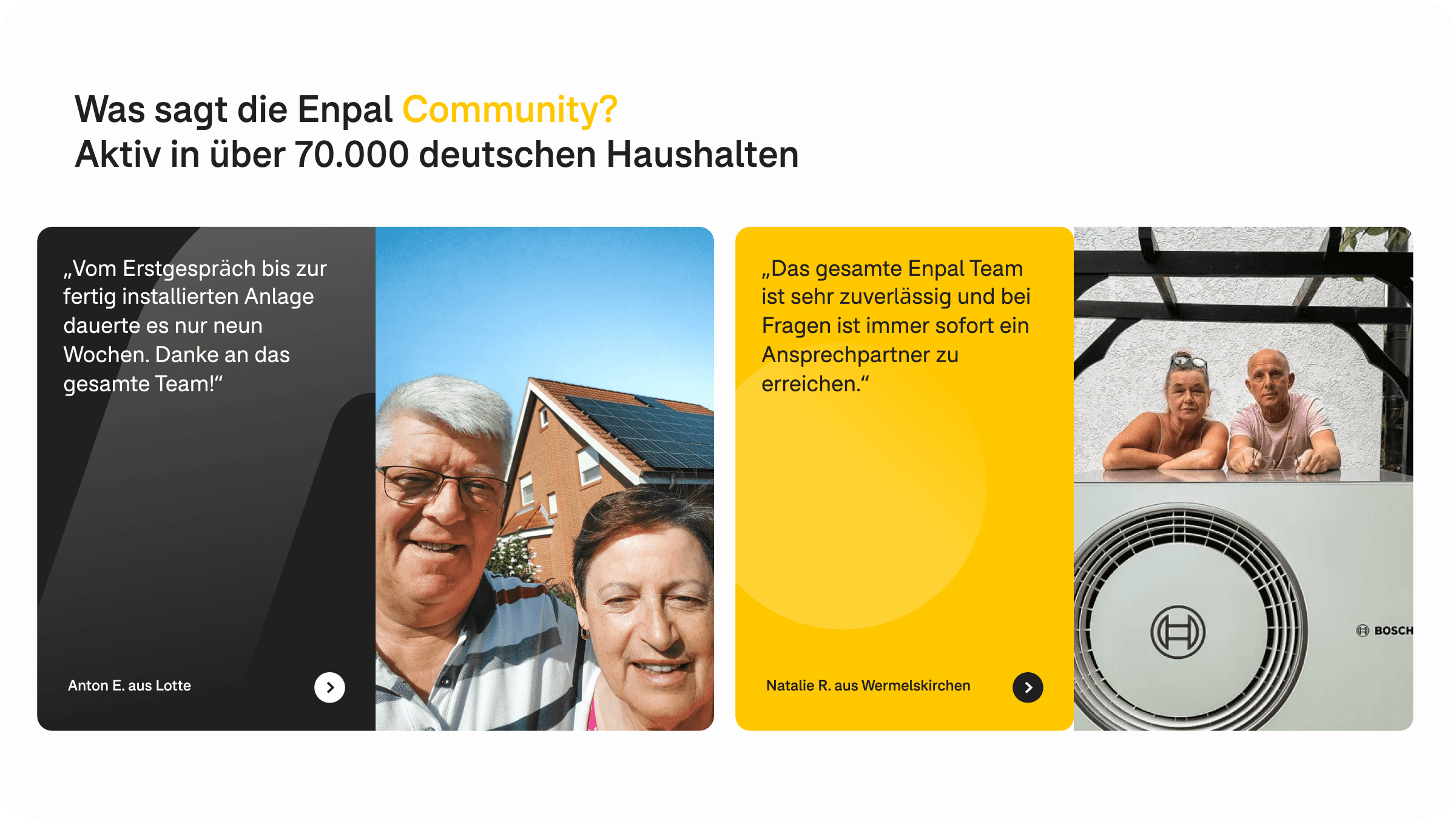 Das überarbeitete Erlebnis hat das Vertrauen der Kund:innen gestärkt und die Entscheidungsfindung entlang der gesamten Enpal Journey verbessert. Klare Produktpfade, echte Stimmen und transparente Ersparnisrechner helfen Nutzer:innen, ihre Optionen schneller zu verstehen – und erhöhen das Engagement auf der Plattform.